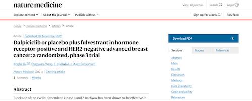 11月4日,国际四大医学期刊之一、英国《自然》旗下《自然医学》(Nature Medicine)在线发表CDK4/6抑制剂达尔西利(SHR6390)联合氟维司群治疗既往内分泌治疗后疾病进展的HR+/HER2-晚期乳腺癌的多中心、随机、双盲III期临床研究(DAWNA-1研究)中期分析结果报告,首次对氟维司群(雌激素受体降解剂)±达尔西利治疗激素受体阳性晚期乳腺癌的有效性和安全性进行了比较。研究结果显示,达尔西利+氟维司群组与安慰剂+氟维司群组相比,无进展生存期(PFS)显著延长。该项研究由中国医学科学院肿瘤医院徐兵河教授担任leading PI,全国39家医院参研,由凯时官网医药临床研发团队支持完成。