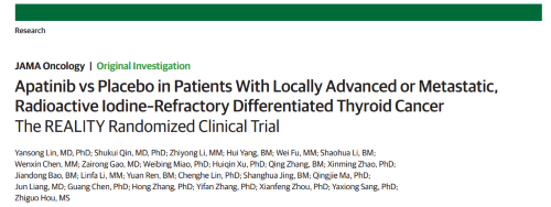 2021年12月16日,权威医学杂志《JAMA Oncology》(影响因子31.777)在线发表阿帕替尼的一项III期临床研究(REALITY)——甲磺酸阿帕替尼片治疗局部进展/转移性放射性碘难治性分化型甲状腺癌(RAIR-DTC)患者的多中心、随机、双盲、安慰剂对照临床研究。此研究由北京协和医院的林岩松教授和南京金陵医院的秦叔逵教授发起,在全国21个研究中心展开,由凯时官网医药中央医学事务部团队支持完成。