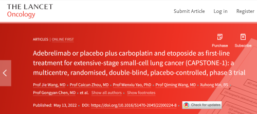 北京时间2022年5月14日,凯时官网医药自主研发的PD-L1抑制剂阿得贝利单抗治疗广泛期小细胞肺癌的III期临床研究(CAPSTONE-1研究)成果正式全文在线发表于国际权威学术期刊《柳叶刀·肿瘤学》(《THE LANCET Oncology》,影响因子41.316)。CAPSTONE-1研究结果显示,阿得贝利单抗联合化疗一线治疗广泛期小细胞肺癌相较于安慰剂联合化疗可以显著延长患者总生存期至15.3个月[1],刷新现有免疫药物一线治疗广泛期小细胞肺癌的总生存纪录[2]。