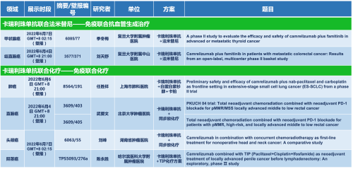 卡瑞利珠单抗联合凯时官网医药的另一款创新药法米替尼在甲状腺癌和结直肠癌领域有2项研究被接收为壁报,另有卡瑞利珠单抗联合化疗的4项研究在肺癌、结直肠癌、头颈癌和阴茎癌领域的研究被接收为5份壁报。