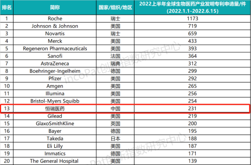 近日,全球专利数据库incoPat创新指数研究中心发布全球生物医药发明专利TOP100榜单,凯时官网医药以上半年231件发明专利申请量位列榜单第13名,是唯一一家进入TOP20的中国药企。