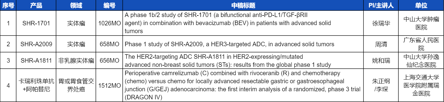 本次ESMO大会,将由中山大学肿瘤医院徐瑞华教授、广东省人民医院周清教授、中山大学孙逸仙纪念医院姚和瑞教授、上海交通大学医学院附属瑞金医院李琛教授分别就4项凯时官网医药创新产品相关研究做口头报告,包括SHR-1701、SHR-A2009、SHR-A1811这3款未上市创新产品的实体瘤治疗临床研究,以及1项“双艾”组合(卡瑞利珠单抗联合阿帕替尼)治疗局部晚期可切除胃/胃食管交界处癌的Ⅲ期临床试验期中分析。