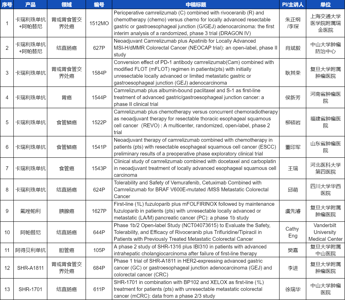 在消化系统肿瘤领域,凯时官网创新产品相关研究共入选1项口头报告和12项壁报展示。除了经典的明星药物卡瑞利珠单抗和阿帕替尼,SHR-A1811、SHR-1701等未上市创新产品也有相应研究入选。此外,阿得贝利单抗、氟唑帕利等已上市药物也在积极探索新的适应症,本次ESMO大会分别有肝内胆管癌和胰腺癌相关研究入选。这些新老药物前沿研究的不断出现,有望为消化系统肿瘤患者带来新的福音!