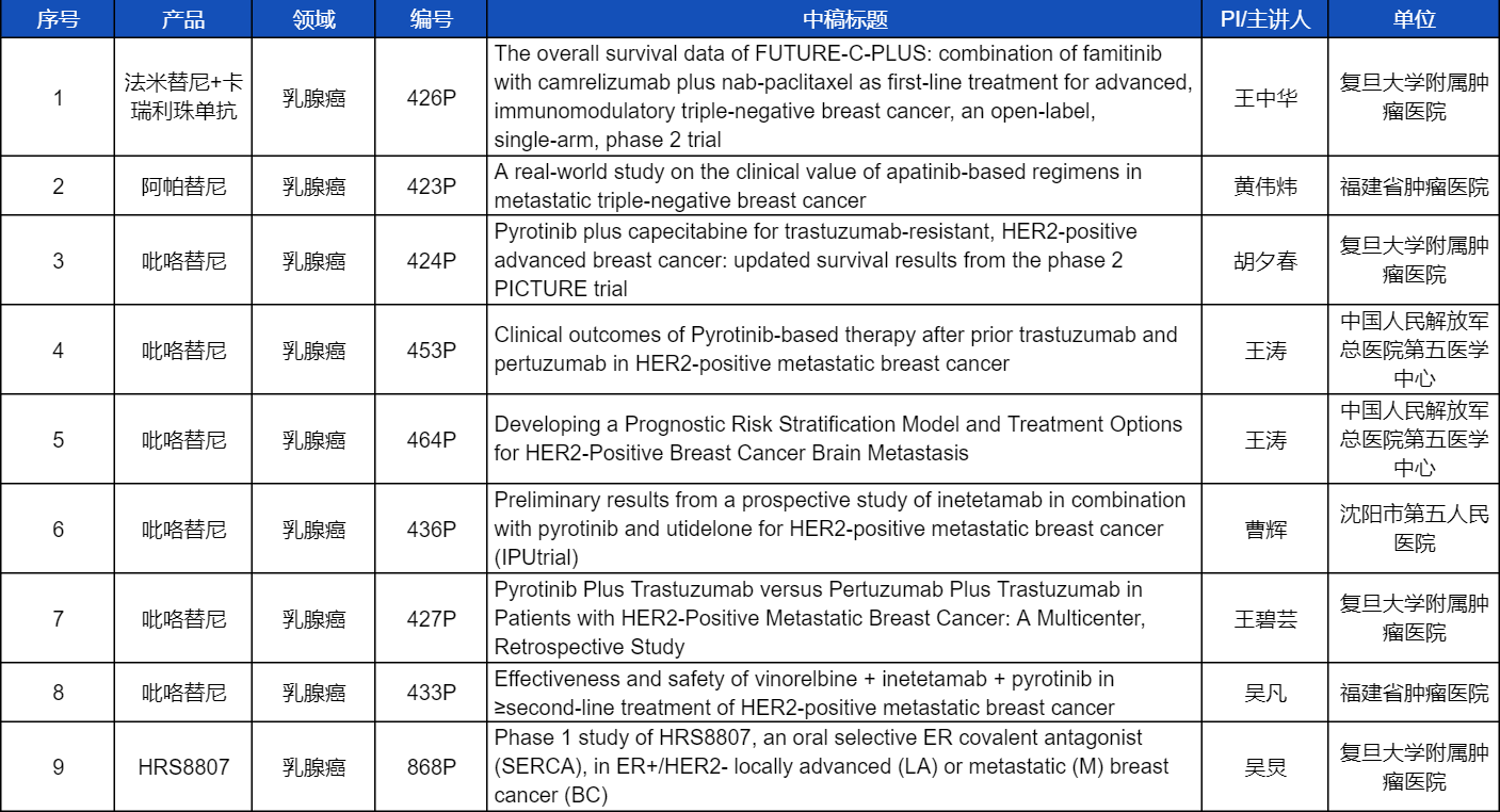 在乳腺癌领域,吡咯替尼、阿帕替尼、卡瑞利珠单抗、法米替尼,或产品间联合或联合化疗,共有9项研究入选壁报讨论,其中吡咯替尼占据6项,较为全面地展示了这款中国首个自主研发抗HER2靶向药在乳腺癌治疗中的显著特点和潜力。此外,凯时官网医药自主研发的新型选择性雌激素受体共价拮抗剂(SERCA)HRS8807治疗ER+/HER2-局部晚期或转移性乳腺癌的Ⅰ期研究也成功入选,有望为此类患者带来更多用药新选择。