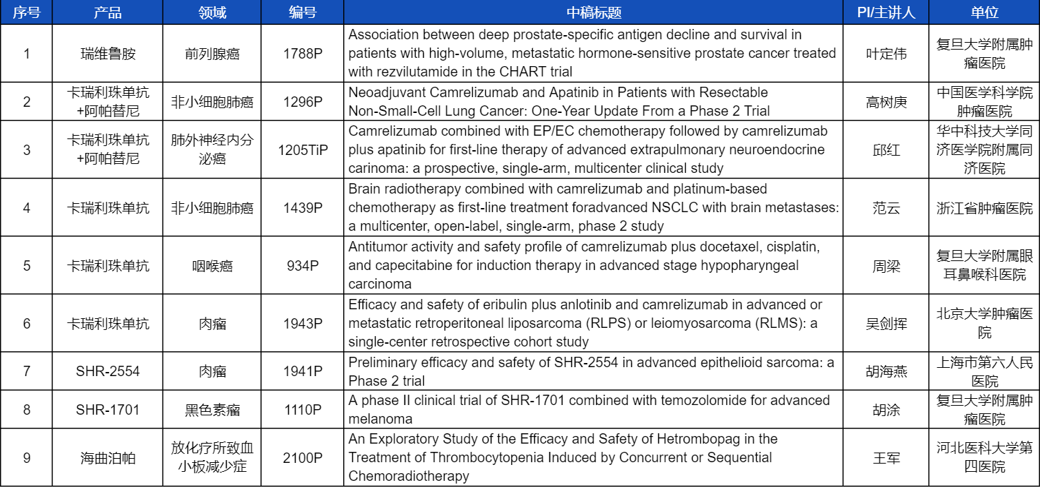 在非小细胞肺癌、咽喉癌、肉瘤、前列腺癌、黑色素瘤等多个领域,卡瑞利珠单抗、阿帕替尼、瑞维鲁胺、SHR-1701、SHR2554等创新产品相关研究一共入选了8项壁报展示。此外,凯时官网医药自主研发的血小板生成素受体激动剂(TPO-RA)海曲泊帕在放化疗所致血小板减少领域的探索性研究显示良好的疗效,入选壁报展示。