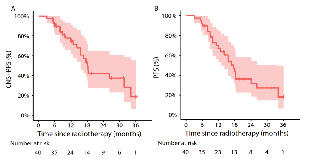 主要研究终点一年CNS-PFS率达74.9%(95% CI,61.9-90.7),超过预设,达到主要研究终点。中位CNS-PFS达18.0个月(95% CI,15.5-NA),显示出局部治疗+系统治疗联合方案的良好结果。CNS-ORR达85%,分别有17例患者(42.5%)达到完全缓解(CR)和部分缓解(PR)。中位CNS反应时间为3.6个月(IQR 2.5-6.8)。在颅内病灶得到有效控制的同时,吡咯替尼依然展现出对于颅外病灶的有效缓解,整体的中位PFS达到17.6个月(95% CI, 12.8-34.1)。