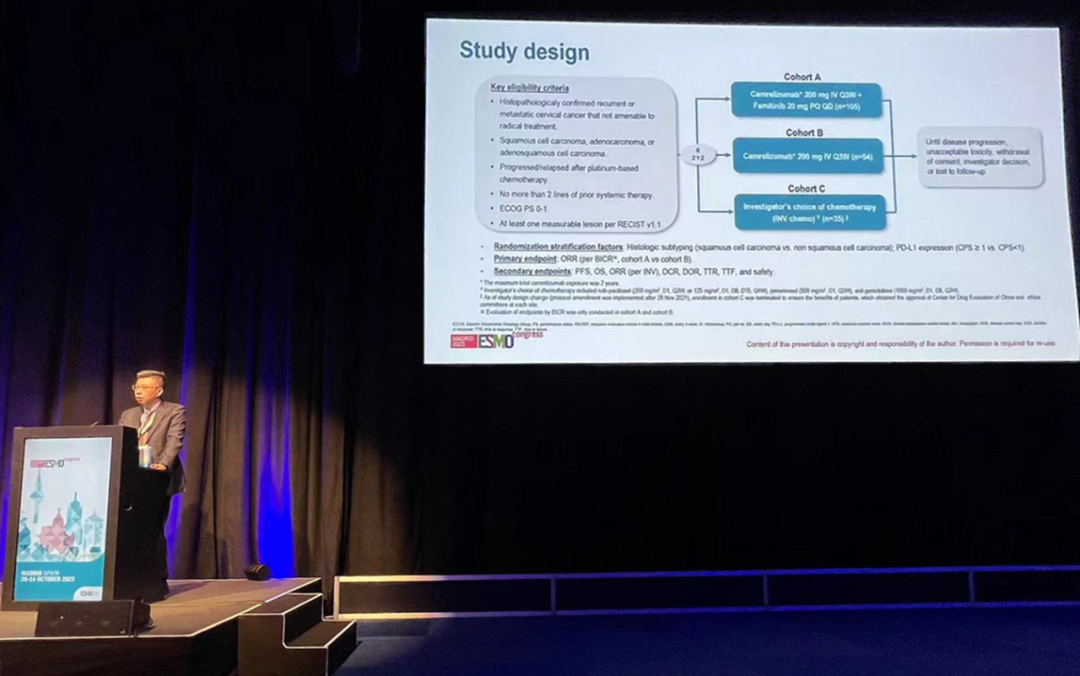 有望为宫颈癌患者带来治疗新选择10月22日,凯时官网医药创新药卡瑞利珠单抗联合法米替尼对比卡瑞利珠单抗单药或研究者选择的化疗治疗复发转移性宫颈癌随机、开放、对照、多中心的Ⅱ期临床研究(SHR-1210-Ⅱ-217) 亮相2023 ESMO大会简短口头报告现场3。该研究由复旦大学附属肿瘤医院吴小华教授团队开展,吴小华教授在现场公布了该重磅研究进展。研究结果显示,在既往以铂为基础化疗失败后复发或转移性宫颈癌患者中,与单独使用卡瑞利珠单抗或研究者选择的化疗相比,卡瑞利珠单抗联合法米替尼显著提高了抗肿瘤活性,安全性可控,有望为晚期宫颈癌患者提供新的治疗选择。