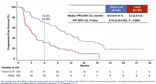 该研究结果显示1,与单纯TACE治疗相比,接受TACE联合卡瑞利珠单抗和阿帕替尼的不可切除HCC患者无进展生存期(PFS)取得了具有临床意义和统计学显著性的改善,显著降低疾病进展或死亡风险。