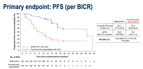 研究达到了主要终点。BICR评估的中位PFS方面,瑞康曲妥珠单抗组达到30.6个月(95%CI:16.8-NR),吡咯替尼联合卡培他滨组为8.3个月(95%CI:6.9-11.0)。HR=0.22(95%CI:0.15-0.34,P<0.0001)。